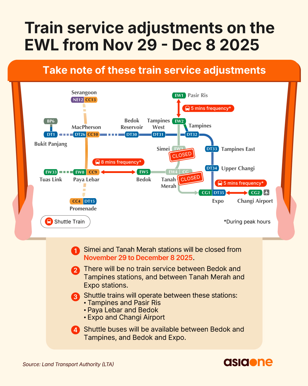 PUBLISHED ONOctober 03, 2025 9:00 AMUPDATEDOctober 03, 2025 9:37 AMBYLim KeweiThere will be no train service between Bedok and Tampines stations, as well as between Tanah Merah and Expo stations due to track work on the East-West Line (EWL) from Nov 29 to Dec 8.