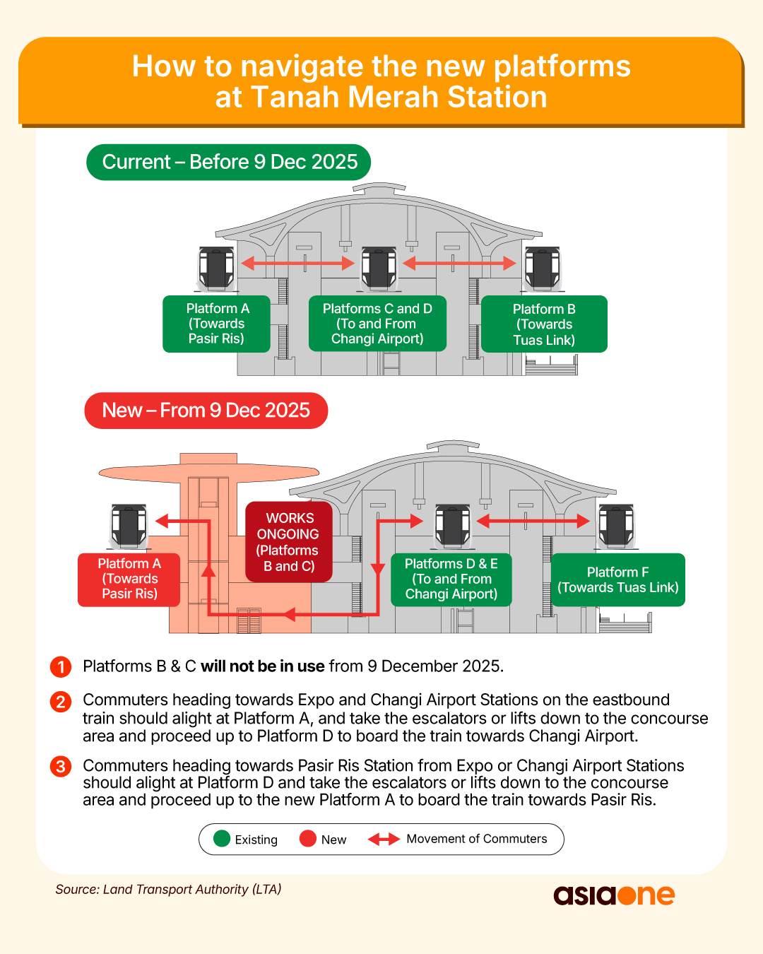 This is because the existing platform currently used by eastbound trains will be modified to allow the extended Thomson-East Coast Line to operate from two tracks at Tanah Merah station.