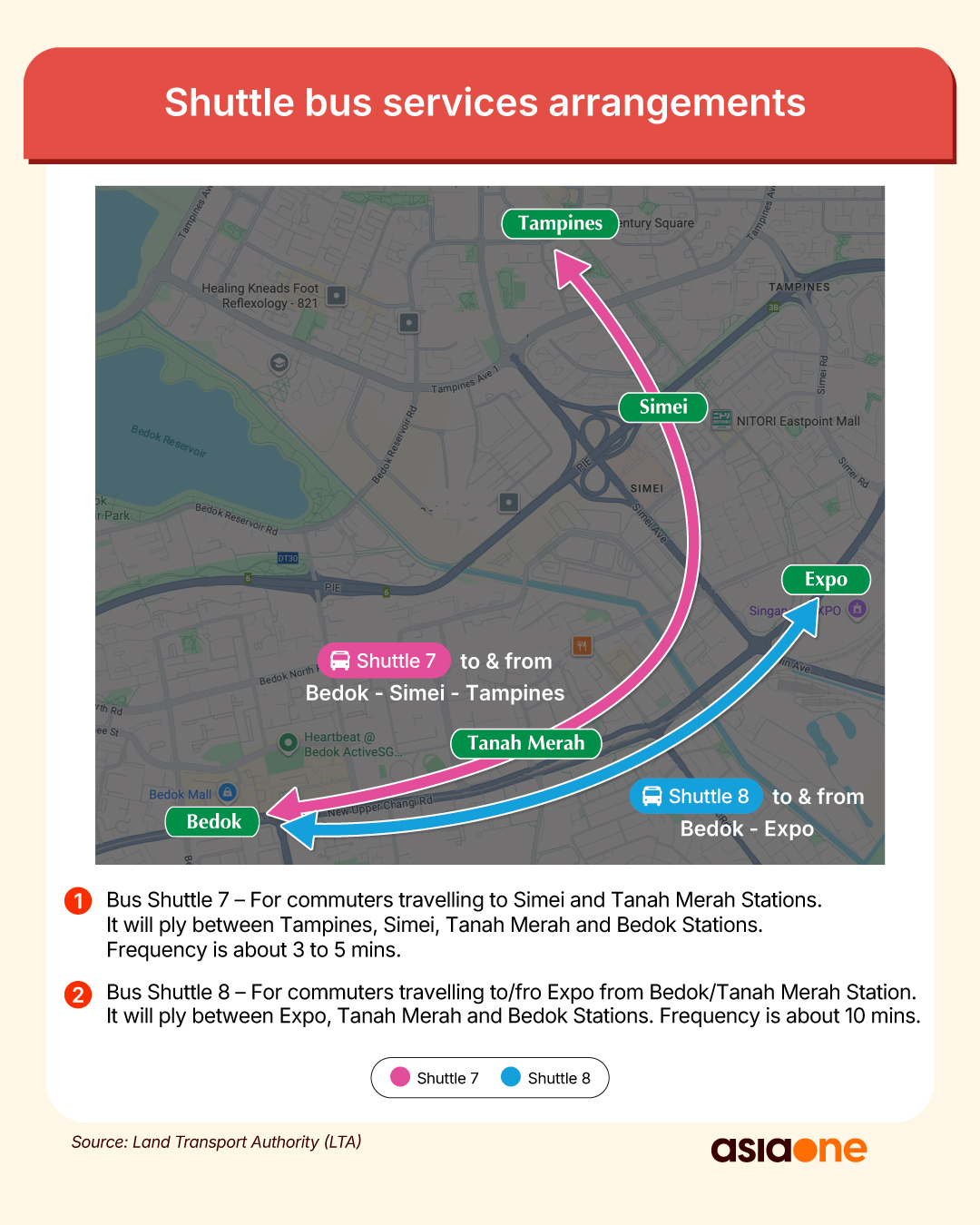 Commuters travelling between Bedok and Tampines stations can take Shuttle 7 which is expected to arrive every three to five minutes, while Shuttle 8 will ply between Bedok and Expo stations at 10-minute intervals.