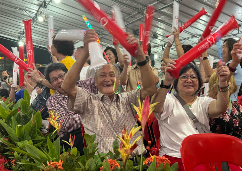 PM Wong arrived around 10.30pm to cheers and applause. As he made his way to the stage, he greeted and shook hands with the people.