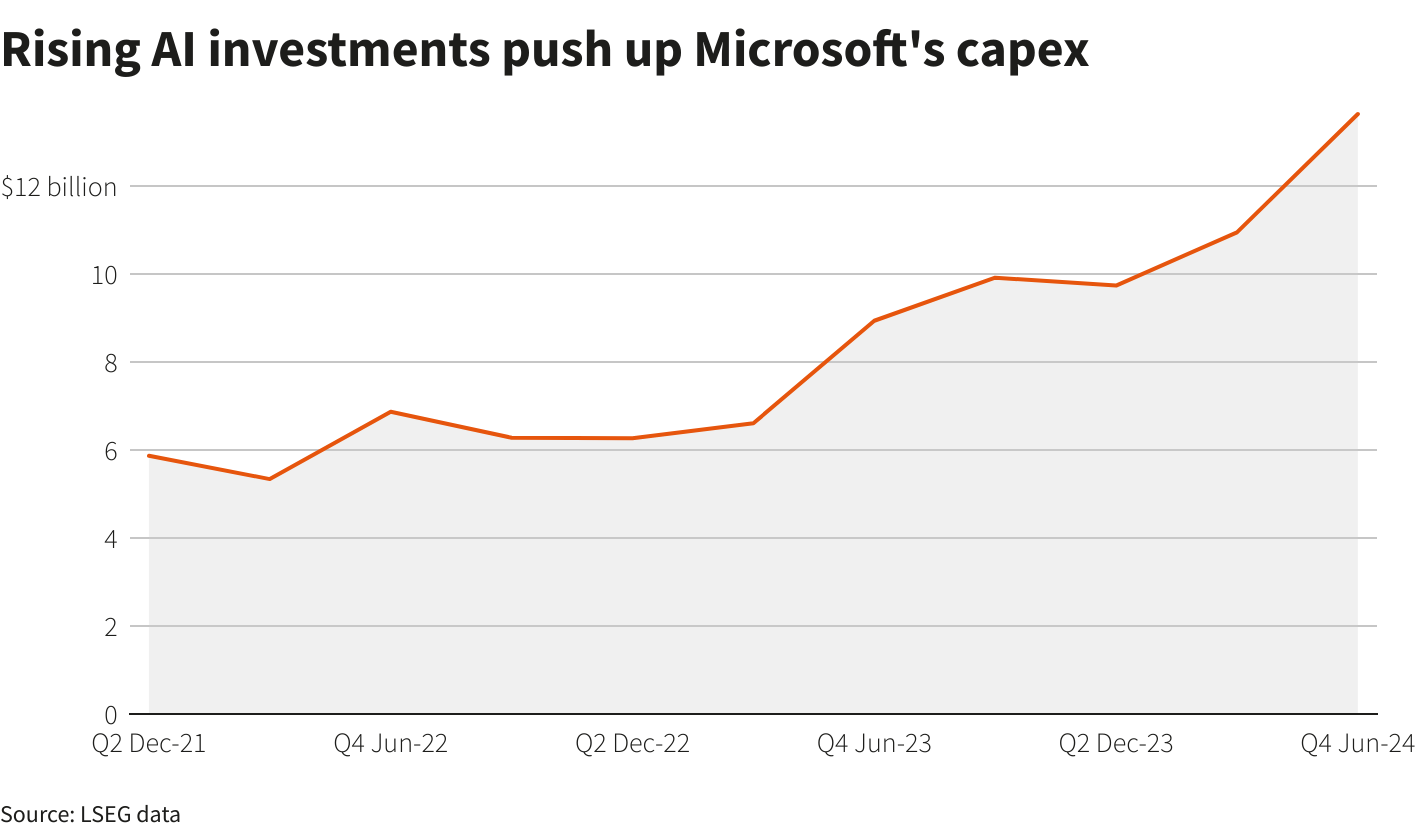 Microsoft's capital spending likely surged about 53 per cent year-over-year to US$13.64 billion (S$18.32 billion) in the period, according to 16 analysts polled by LSEG. A big step up from the US$10.95 billion in expenditure it recorded in the previous quarter.