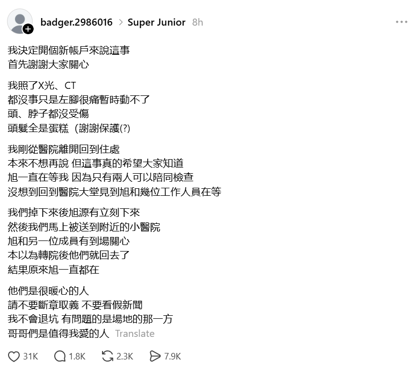 She said: "When we fell, Ryeowook and Siwon immediately came offstage. We were sent to the nearby hospital immediately, and Ryeowook and another member also came to the hospital to ask after us.