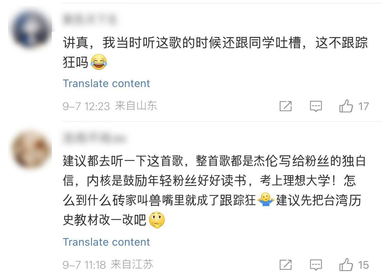 "I suggest you listen to this song. The entire song is Jay Chou's letter to fans, encouraging young fans to study hard and enter their ideal university! How did it become a song about a stalker in the mouths of experts and professors? I suggest making a change to Taiwan's history books first," said one netizen.