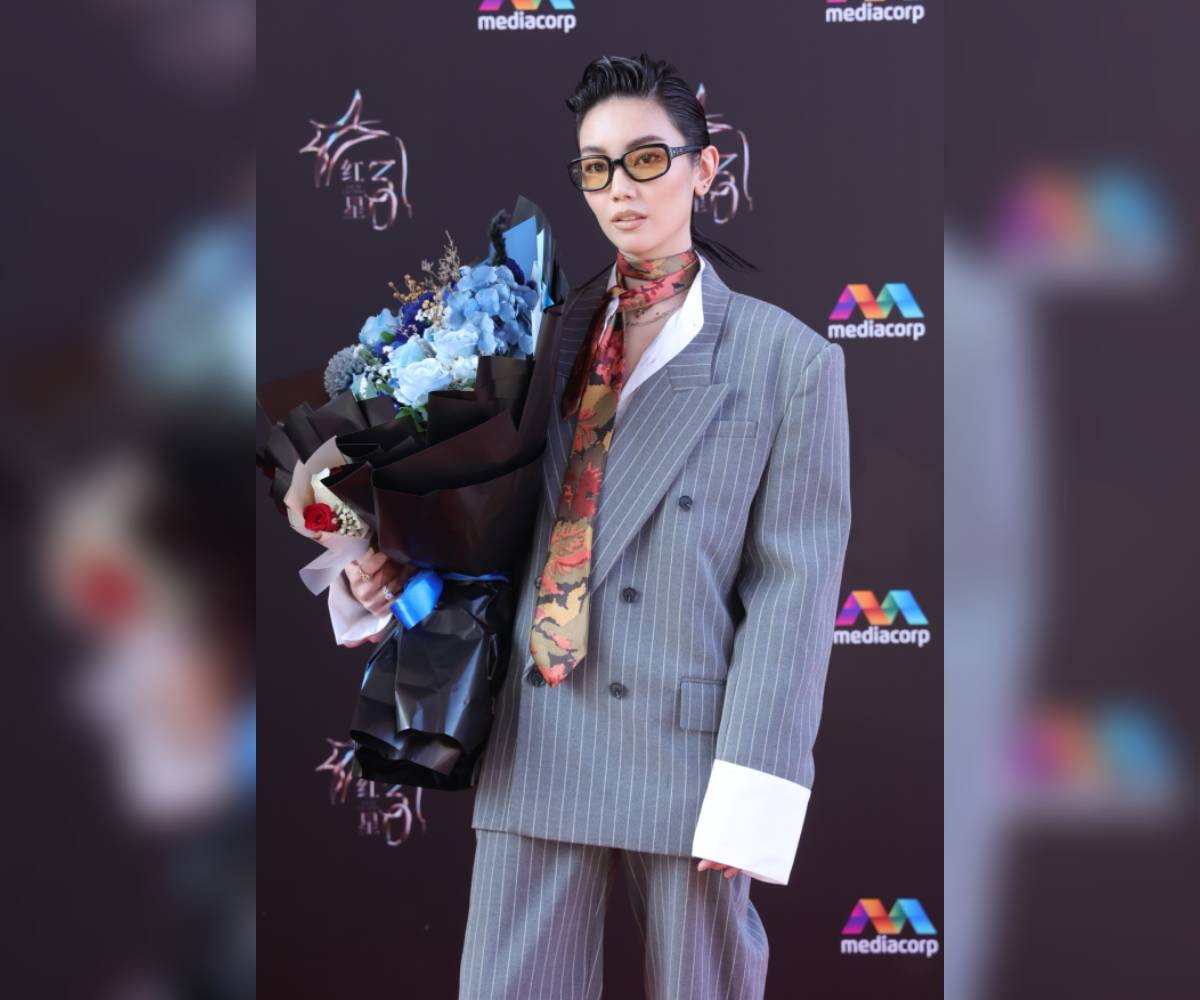 Sheryl Ang's androgynous look was glaringly different from the rest of the celebrities'. She went for an oversized pinstriped grey suit and trousers, with a vintage-core floral scarf draped from her neck to chest.