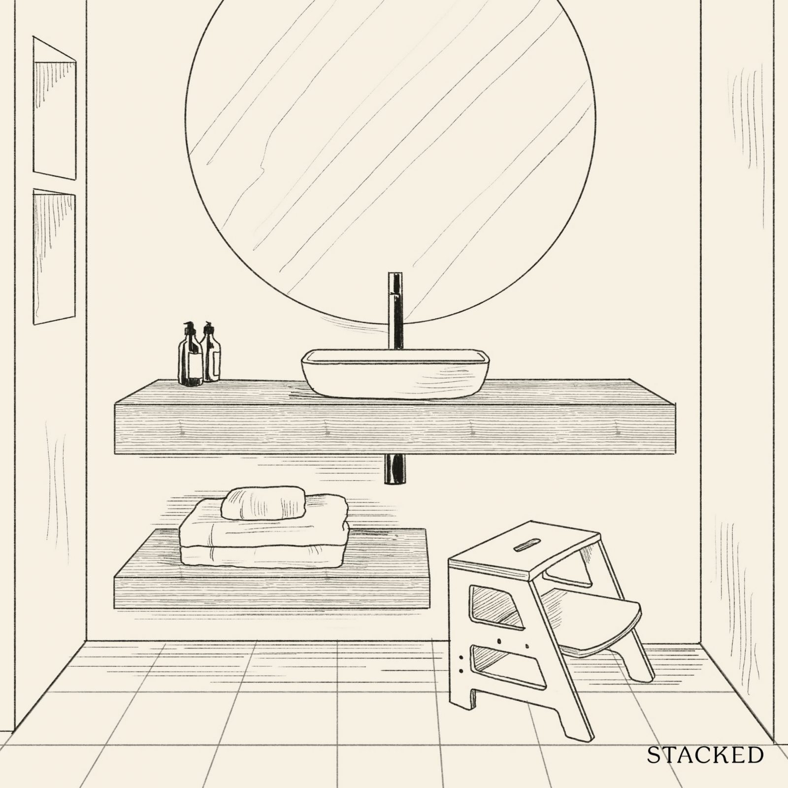 Traditional basin counters are just a solid cupboard with all the piping, under the sink. But you can go for a "floating" option with space underneath, where you then have room for something like a step stool. This can allow your children to better reach the basin, and prevent a potential mess.