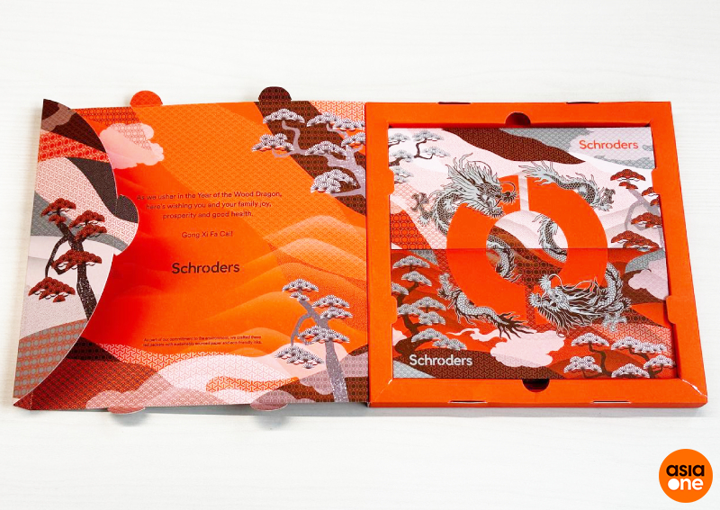 Each set comes with two different kinds of red packets, and when you combine both, it forms Schroders' logo. The dancing Wood Dragons also come together to form a circle.