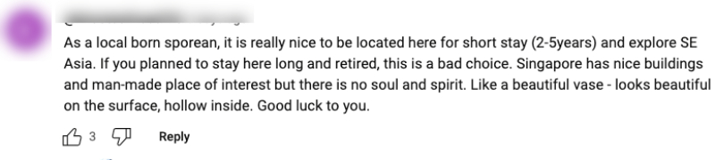They shared that while it's nice to live here for a few years, long-term stay and retirement is "a bad choice" because there is "no soul and spirit".