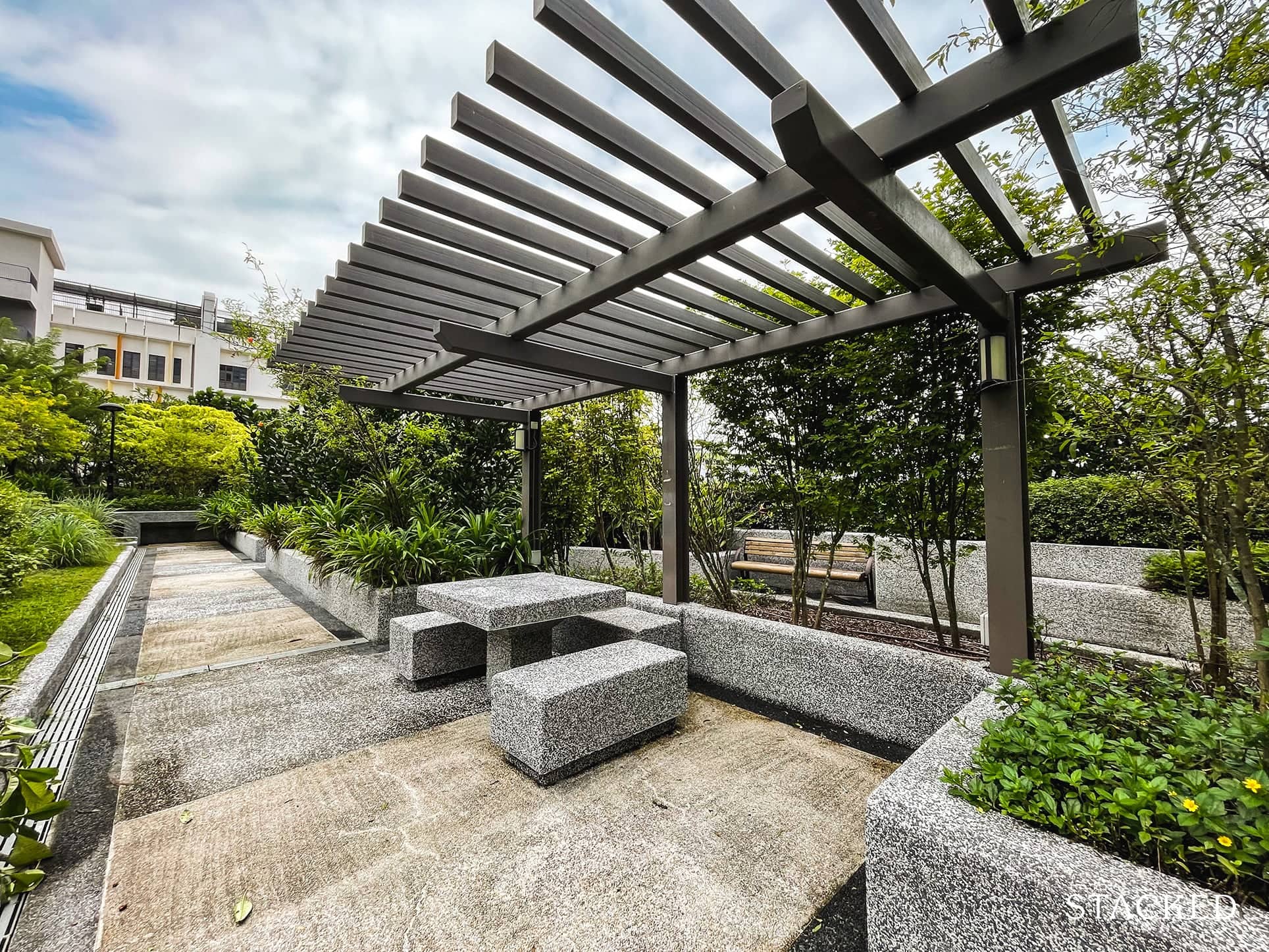 Stepping out onto the rooftop garden, you’ll see that it has some nice greenery and is well-kept. It’s also quite a decent size, sporting quite a number of seating areas.