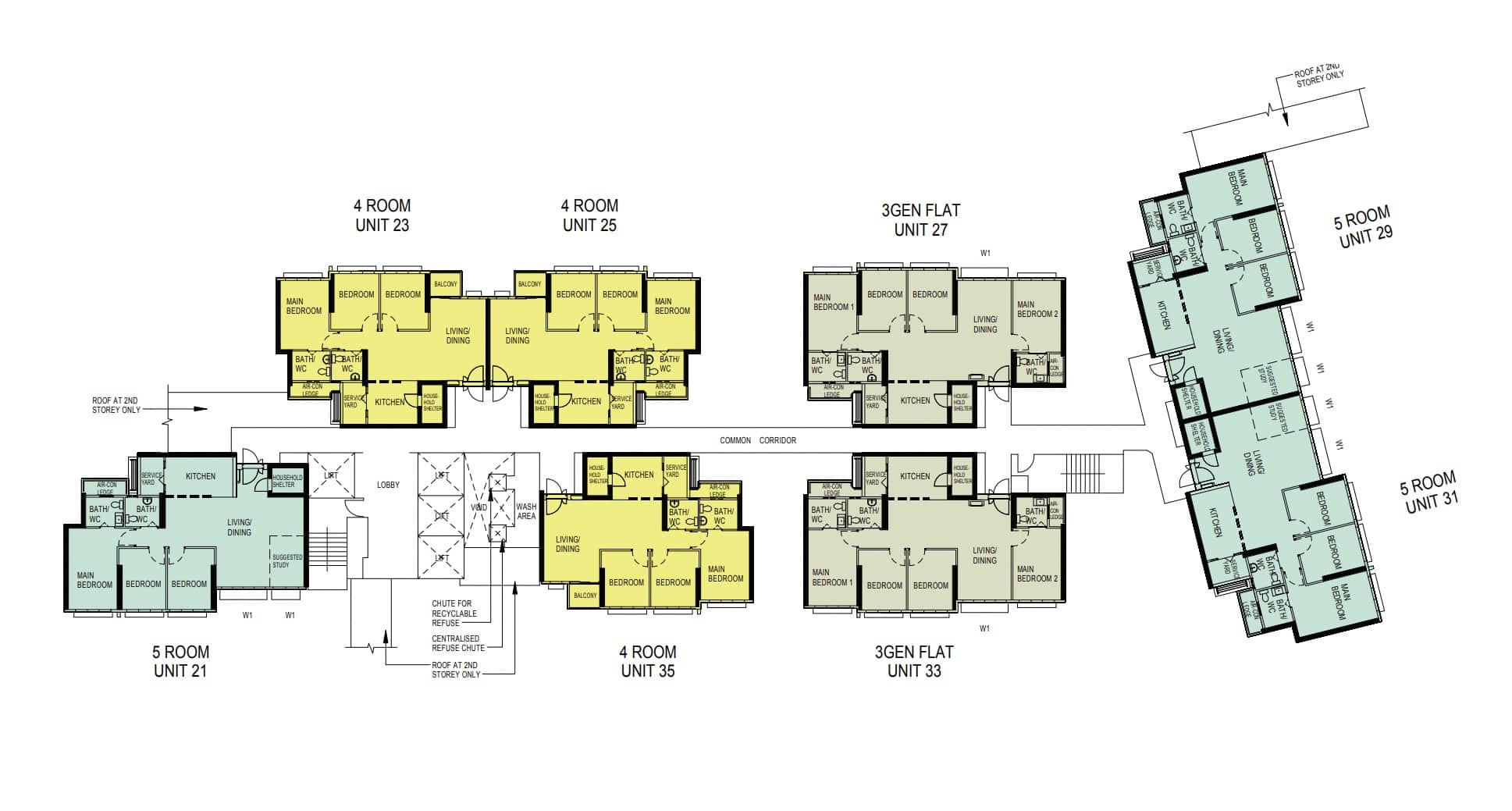 Needless to say, the position of your unit within the corridor layout matters – a lot. Naturally, corner units are the best – you won’t need to share the common space outside. In this case, the best unit is unit 21 in the above layout. There’s no reason for anyone to approach your home since there are no other units there. Moreover, it’s close to the lift yet far enough from the rubbish chute but not too far that it’s inconvenient.