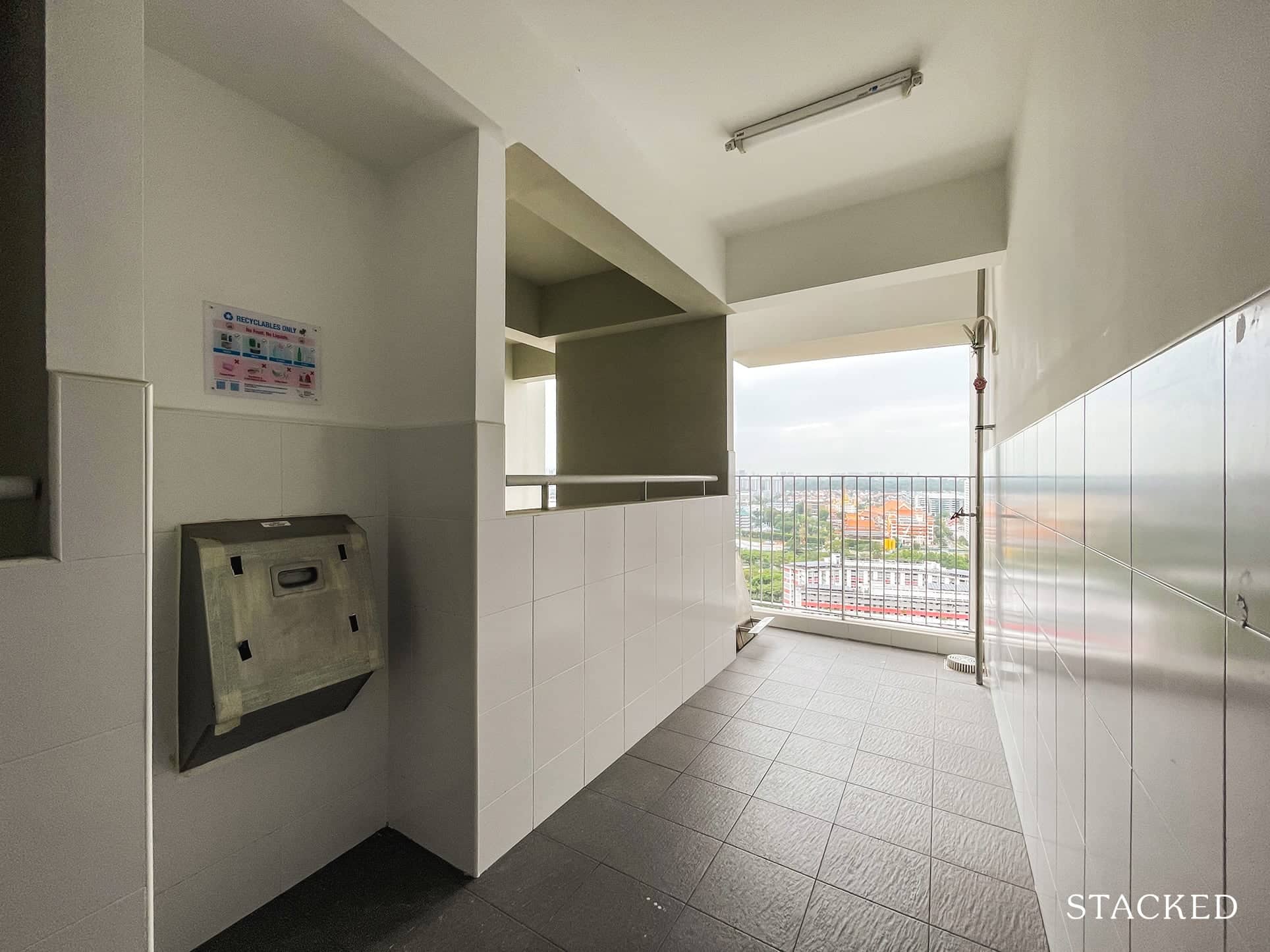 There’s one recycle bin and one regular waste disposal chute, which is either next to the lift lobby or separated from the lift lobby by the staircase.