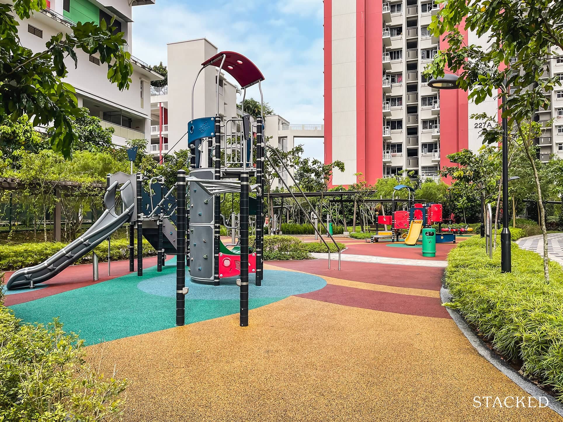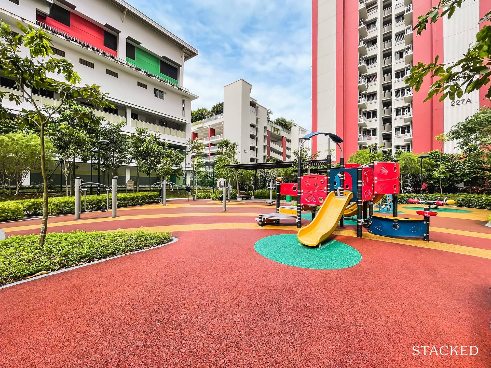 This is due to the wide amount of space between each building. For example, block 228A is just next to the main facilities area, but it’s a good 40+ metres away from the low-rise Ang Mo Kio Primary. Blocks 227A and 228B are also around 60+ metres apart.