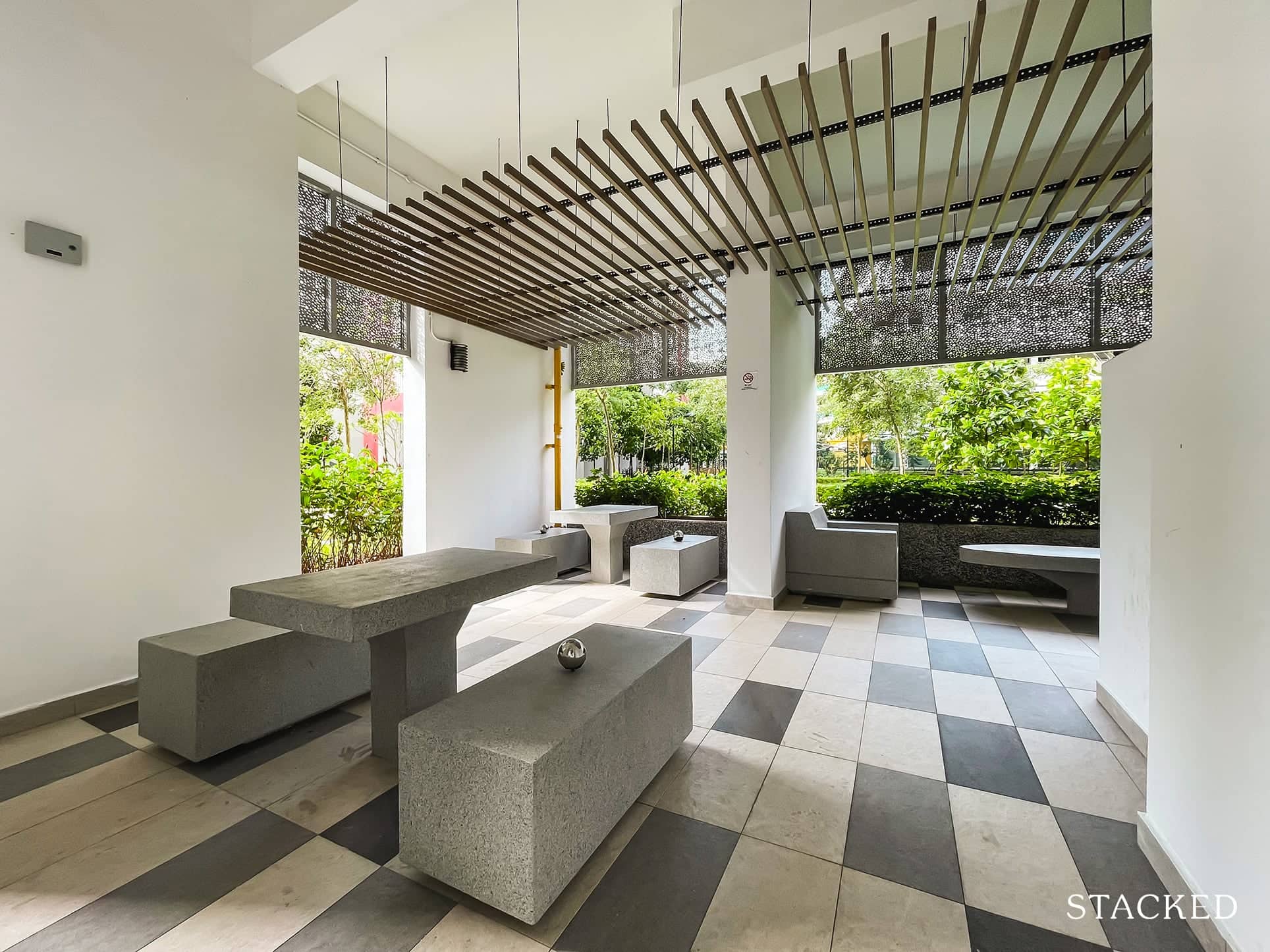 There are two playgrounds and three fitness corners in total, making it sufficient for this cluster. The facilities are well spread out from each other, and the surrounding area doesn’t feel very dense at all given how open the space is. There are also sheltered seating areas for parents to sit and watch over their kids while they play.