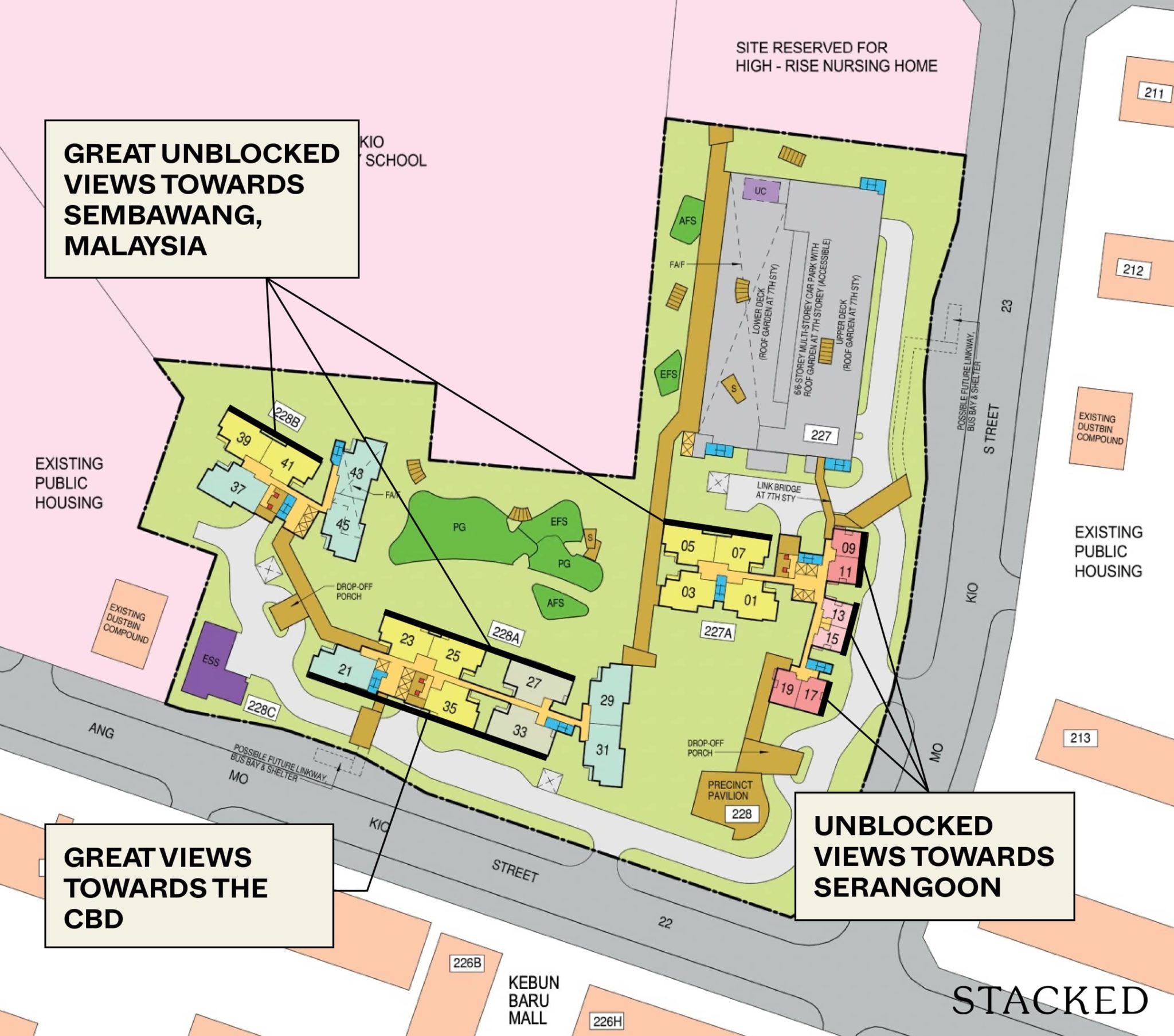 All of the stacks here have a pretty good distance to the next building. You’ll also notice that none of the stacks directly faces another unit within the same development given how it’s laid out. However, do bear in mind that stacks 05 and 07 face the MSCP directly.