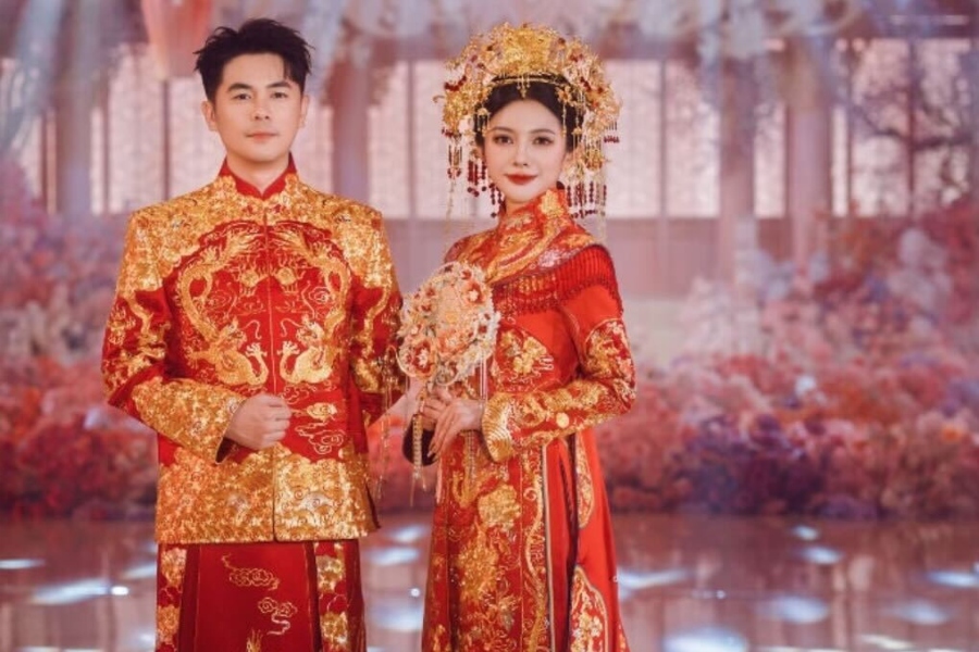 The couple, dressed in traditional Chinese wedding attire, held a grand wedding at the hotel's banquet hall.
