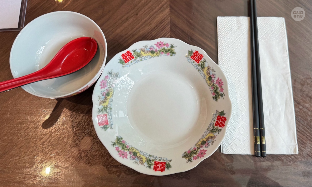 The tables were also set with retro Chinese tableware — something you might see at a grandparent's house.