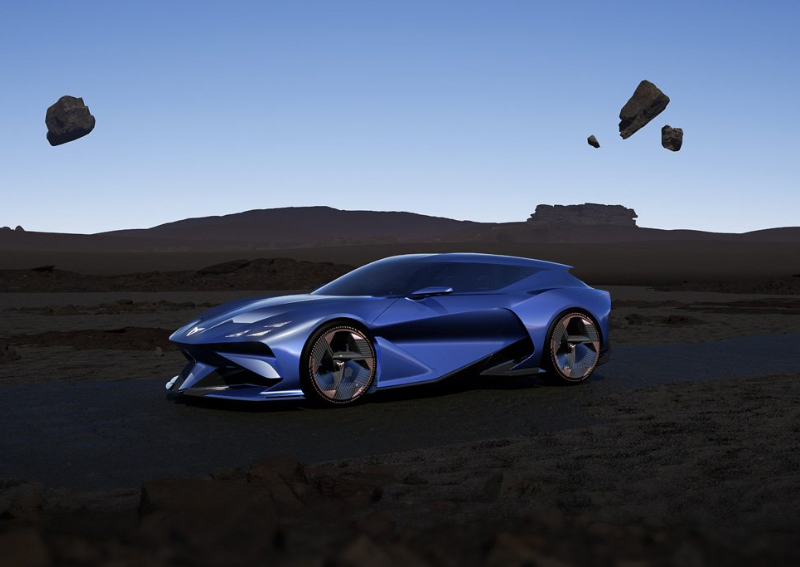 The DarkRebel sports the proportions of a sports car with a shooting brake architecture. It utilises a sharp front with a long, arrow-shaped bonnet, while the cabin has been pushed to the rear.