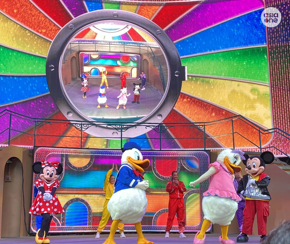 The show, which is performed on the Garden Stage at Disney Imagination Garden, features Mickey Mouse and his friends hosting a dance party, set against the backdrop of a spinning virtual colour wheel.