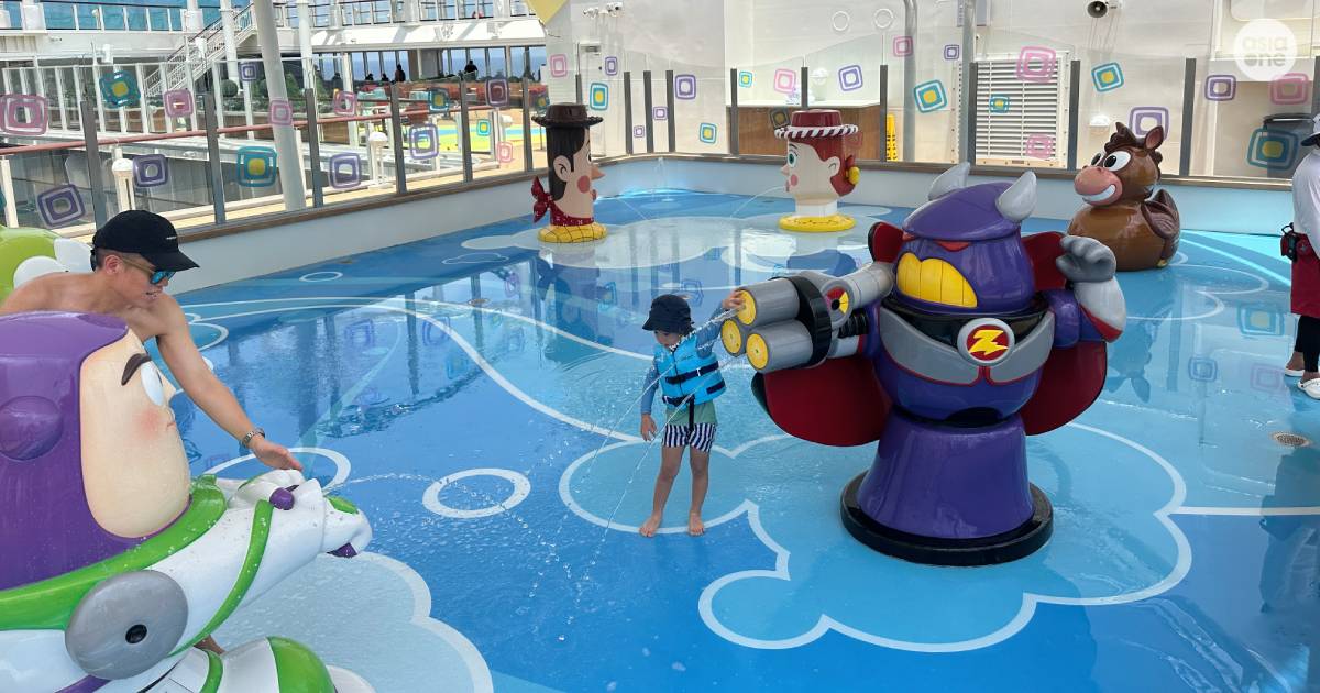 The Flying Saucer Splash Zone is a Toy Story-themed water playground on the upper decks, designed to make guests feel like they are inside a Pizza Planet toy set.