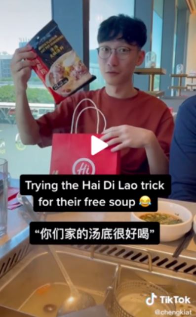 | 你家的汤底好好喝 | nǐ jiā de tāng dǐ hǎo hǎo hē | Your soup base is delicious | Free Hai Di Lao soup pack |