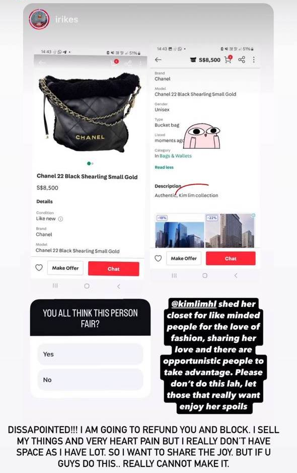 She also shared her frustrations with Her World Singapore: "Honestly, when I decided to let these bags go at a more affordable price, it’s really because I hope these bags can go to people who truly want them. But I guess I didn’t expect that there are people who will do such things.
