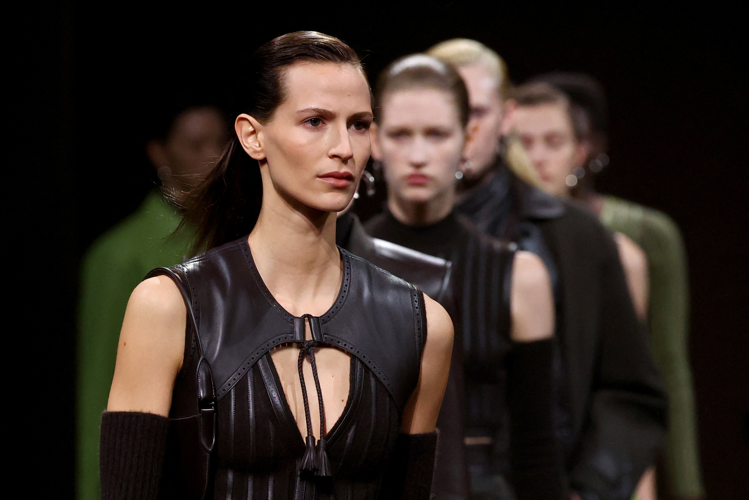 PARIS — Hermes designer Nadege Vanhee presented a fall-winter 2025 collection of glossy coats, dresses and trousers in dark-coloured leather on Saturday (March 8), showing the sleek styles on a dirt-covered runway in Paris.