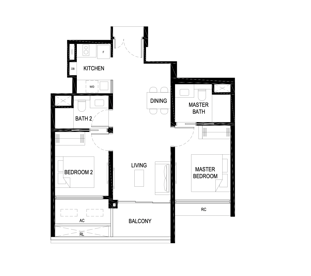 This is the smaller 2-bedder layout. Notice that despite the reduction in size, the kitchen keeps to the same U-shaped layout; the developer knew what works and kept it uniform.
