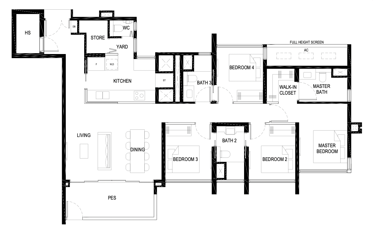 This is the larger 4-bedroom layout. Notice the kitchen forms a U-shaped nook, which has the added benefit of a nearby storage room.