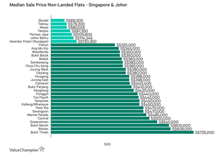 In order to compare prices between areas Singapore and Johor, we compared the median sale price of homes in areas of each. To make a relevant comparison, we used pricing data for HDB resale flats in Singapore and and non-landed flats in areas of Johor with sufficient data.