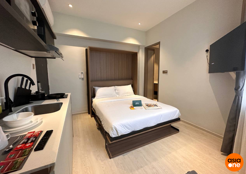 I got the Deluxe Queen Suite, which features a Queen-sized Murphy bed that can be folded upwards and turned into a desk.