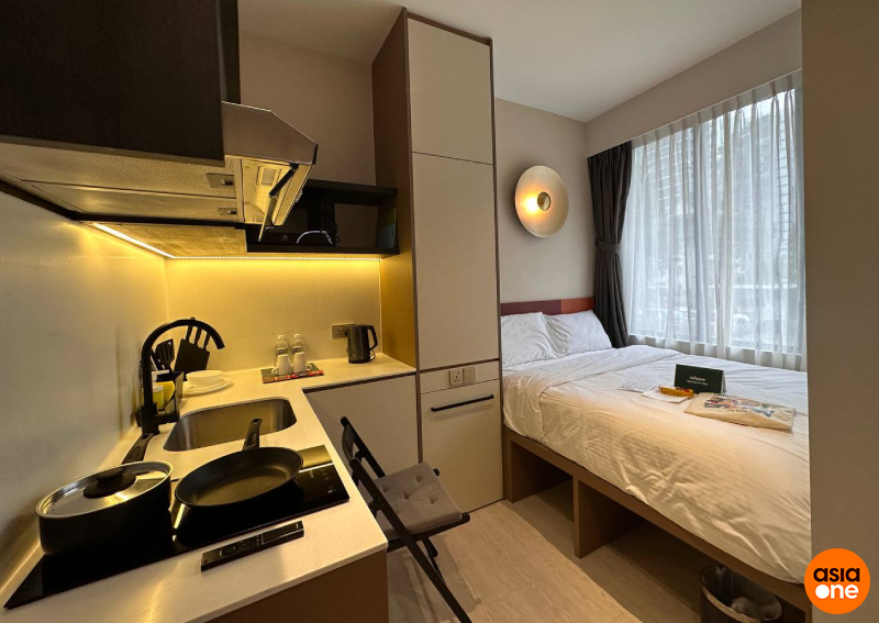 On the other hand, my colleague got the Queen Suite, which comes with a Queen-sized bed and a pull-out table that functions as a workstation and dining table.