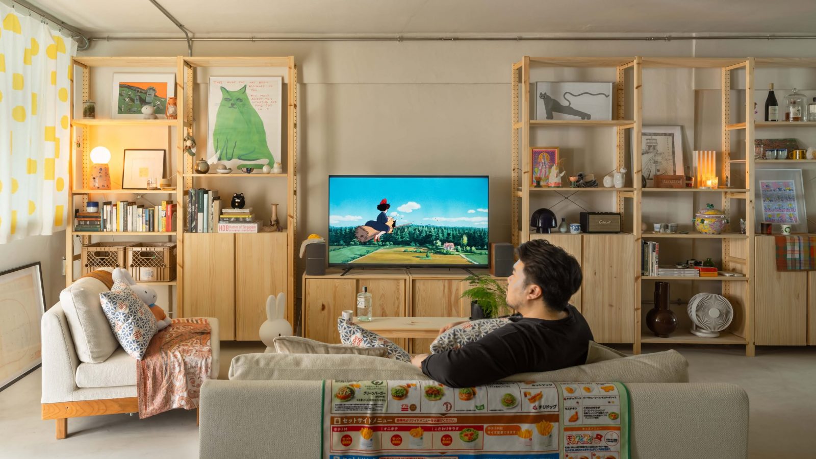 Upon entering, the living area greets visitors with a tapestry of objects and colours. A wall was removed to open up the second bedroom, expanding the space seamlessly. Pinewood shelves from Ikea's IVAR system line the walls, displaying meaningful collectibles.
