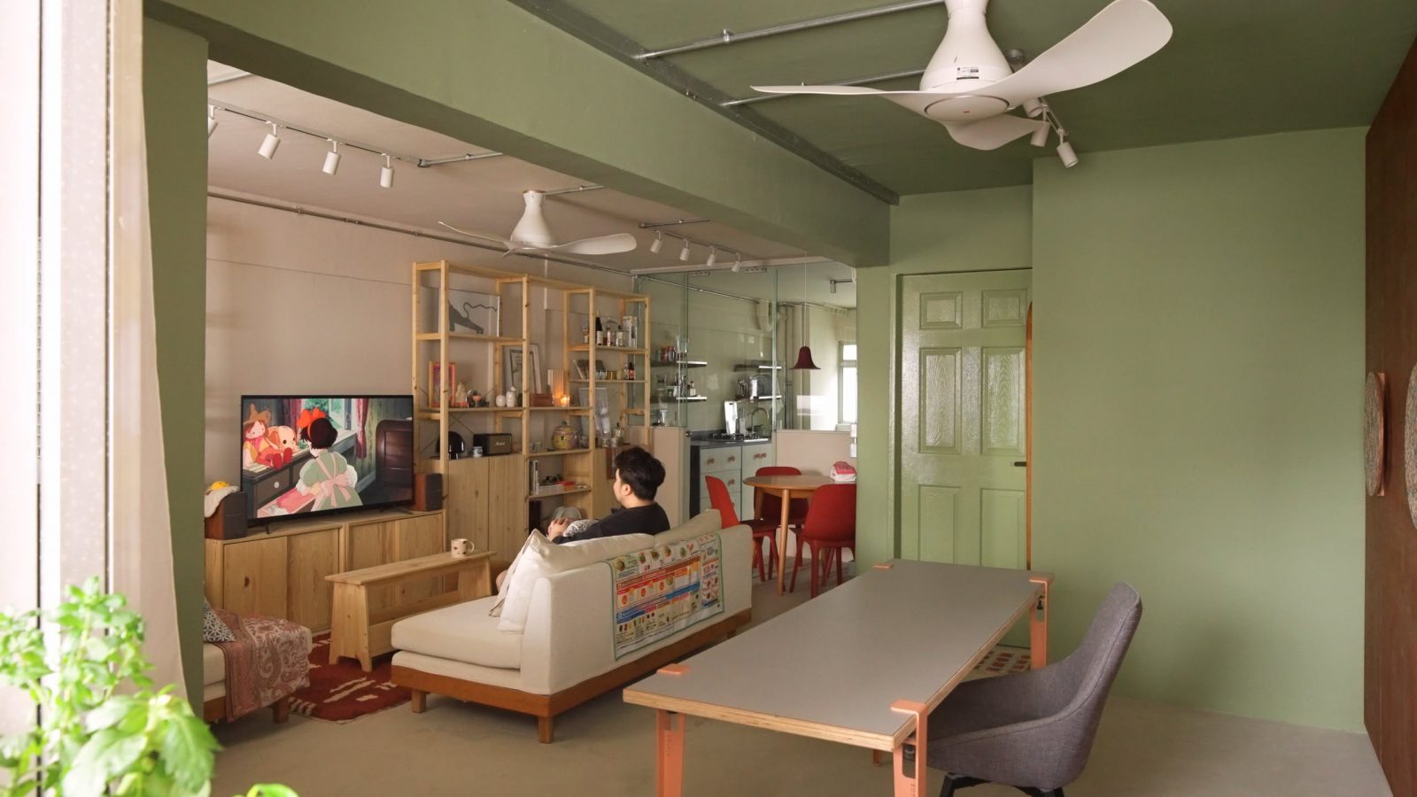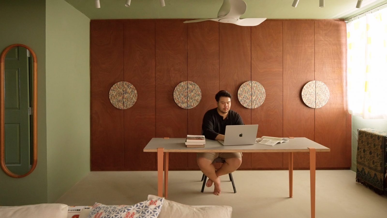 The study, once the second bedroom, features grey-green walls to delineate its original structure, a central worktable, and a striking Sapele plywood storage cabinet with Italian veneer detailing.