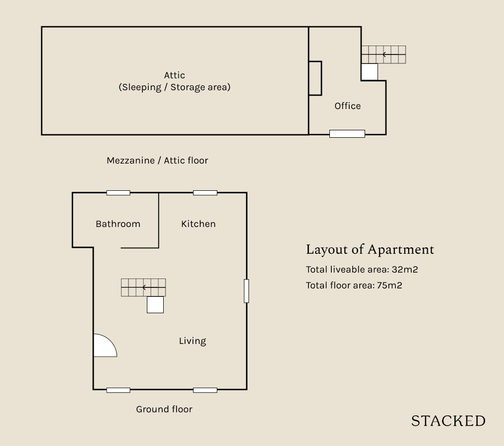 It was an attic apartment with an official 32m2 area size due to the roof's slope, and it has two mezzanines; a 5m2 mezzanine that serves as an office, and a whooping 25m2 mezzanine that was used as a sleeping space and closet.