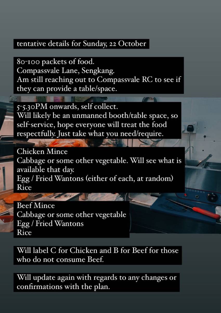 In an Instagram story on Thursday (Oct 19), he shared that this will tentatively be held on Sunday (Oct 22) at Compassvale Lane, Sengkang, as he is still in the midst of reaching out to Compassvale RC to see if they can provide a space.