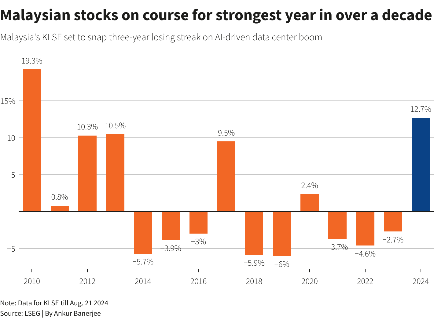 The stock benchmark KLCI has risen more than 12 per cent this year on the back of an AI-driven data centre boom, outperforming the six per cent rise in the MSCI Southeast Asia index.