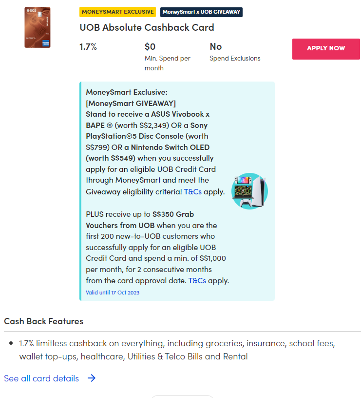 Move over, Citibank, because the new best cashback card on the market is UOB’s Absolute Cashback card. This card takes all the good things about Citi’s Cash Back+ card, such as the $0 minimum spend, and edges out the competition by adding a 0.1 percentage point to its rebates — at 1.7% unlimited cashback.