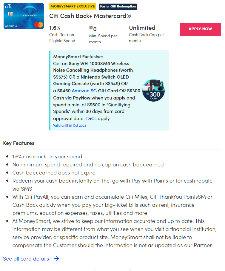 | Low or no minimum spend | Citi SMRT, Citi Cash Back+, Standard Chartered Simply Cash, Amex True Cashback, UOB Absolute Cashback |
