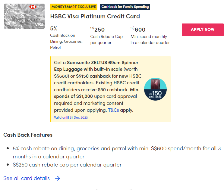 The HSBC Visa Platinum Credit Card is a great cashback card if you regularly spend at least $600 a month on dining, groceries, and petrol. That's because it offers up to 5 per cent cashback on those categories only if you hit this minimum amount.