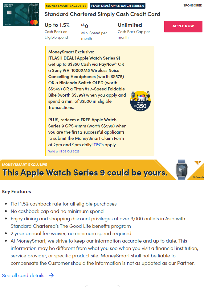 Despite a slightly lower cashback rate than the Citi Cash Back+ Card, the Standard Chartered Simply Cash Credit Card has some advantages: for instance, its annual fee is waived for the first two years. It's also worth comparing their limited-time sign-up promotions to see which gets you a better welcome gift.
