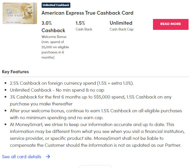 | Unlimited cashback | Citi Cash Back+, Standard Chartered Simply Cash, Amex True Cashback, UOB Absolute Cashback, CIMB World Mastercard |