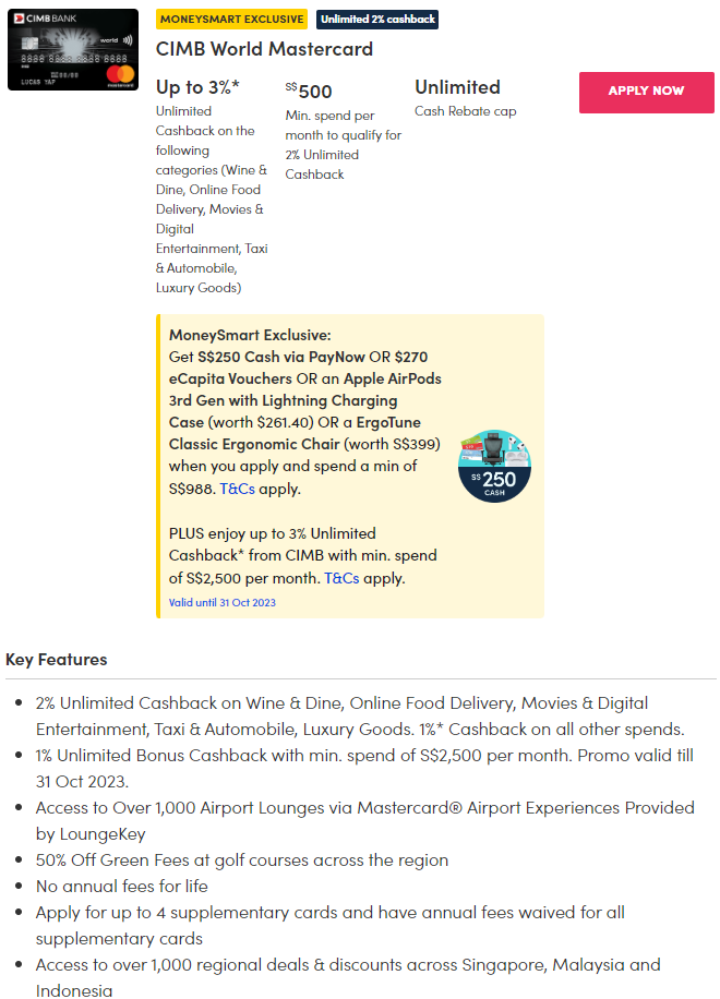 On all other spends, you earn 1 per cent unlimited cashback. From now till 31 Oct 2023, you get an additional 1 per cent unlimited bonus cashback if you spend a minimum of $2,500 per month. That's no small sum, but it does make good use of your unlimited cashback.