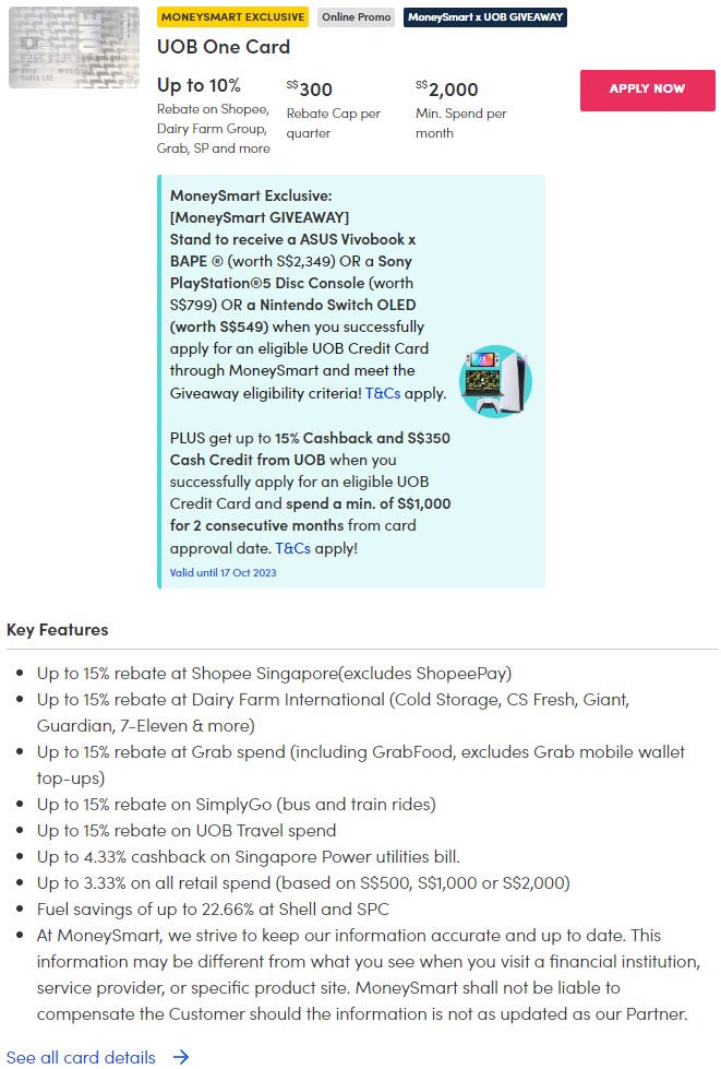 At the current cashback rates, the UOB One card is indeed generous if you hit certain monthly spends. But once you hit the minimum spending requirements, it is a waste to spend more. So, you’ll need to monitor your spending on the card.