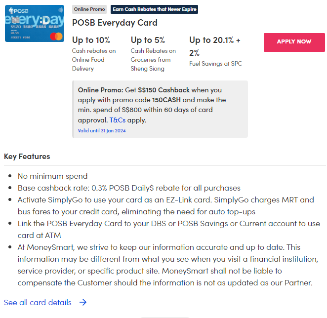 The POSB Everyday Card doesn't look very alluring, but it's good enough for life's basic needs. There is no minimum spending requirement for you to earn 5 per cent cashback at Sheng Siong. For pet owners, use this card at Pet Lovers Centre for three per cent cashback on regular-priced items, provided you hit the $15 minimum purchase amount.