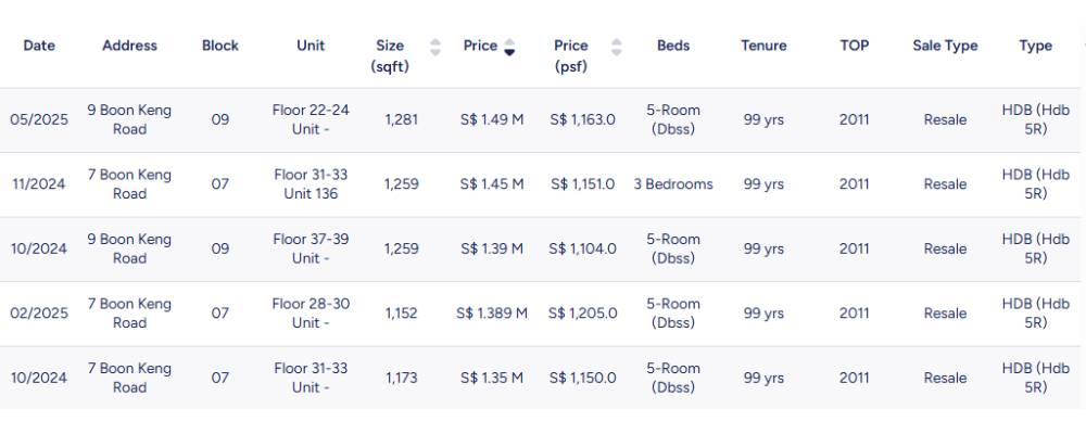 While City View @ Boon Keng leads in Kallang, The Peak @ Toa Payoh still holds the record for the most expensive DBSS flat in Singapore. A 5-room flat in Block 138A changed hands for $1.6 million in January 2025, working out to $1,270 psf.