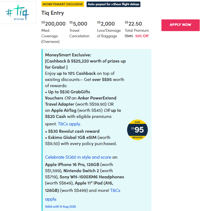 Take 50 per cent off your Tiq Single Trip policy premiums and enjoy up to 10 per cent cashback on top of over $95 worth of rewards:
