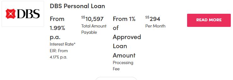 | DBS/POSB Personal Loan | 1.99per cent (EIR 4.17per cent) | 1per cent | ~$294 | – Singaporean/PR – Foreigners with existing Cashline and/or Credit Card account – Min. S$20,000 annual income – Existing DBS/POSB customers |