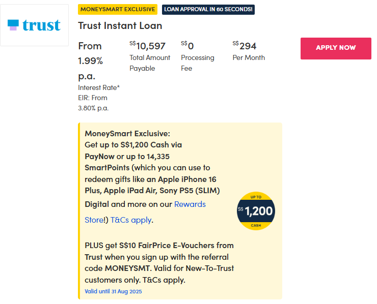 | Trust Instant Loan | 1.99per cent (EIR: 3.80per cent) | 0per cent | ~$294 | – Singapore Citizen/PR: $30,000 – Foreigner: $60,000 – Must have a Trust credit card |