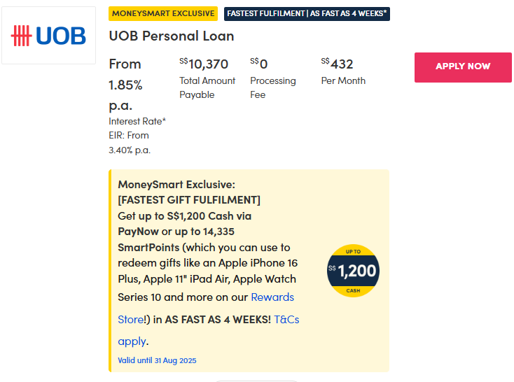 Thinking of applying for a UOB Personal Loan? Apply via MoneySmart now to get a $500 bonus on top of gifts such as: