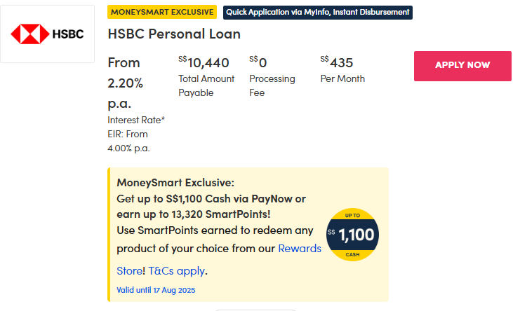 HSBC has dropped their promotional interest rates even further now starting from 2.20 per cent p.a. with an EIR from 4.00 per cent p.a. with no processing fees. Remember, however, that actual interest rates will vary from person to person.
