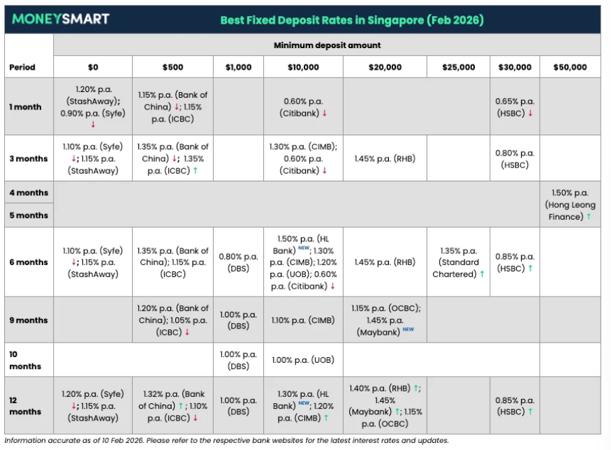 Best fixed deposit rates in Singapore (February 2026): Minimum deposits from $500, rates up to 1.50%